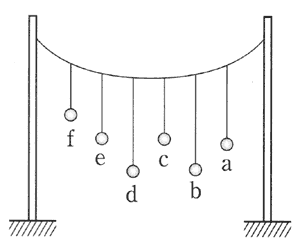 図1のように、糸をゆるくたるませて水平に張り、そこに数個の振り子(a~f)を結びつけて吊るす。これらの振り子の糸の長さは長いものや短いものまちまちにする。ただし同じ長さのものを1組作っておく。いまそれをbとdとしよう。