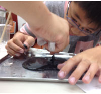 ただスライムをつくるだけではなく、なぜスライムができるのかという秘密を探ったり、作り方を変えて堅さが違うスライムや磁石に反応するスライムを作って遊びました。