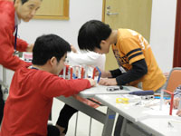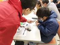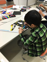 様々な電気の作り方を、先生がいろいろな道具を用意して見せてくれました。最後はおなかをたたくと目が光るおもちゃをつくりました。